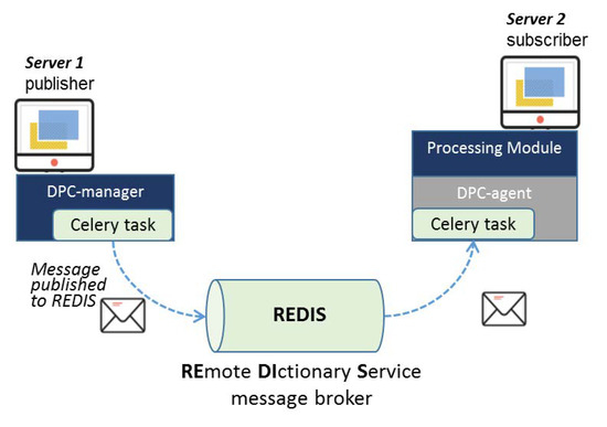 The rationale of the communication technology is explained in the schema shown in Figure 5 depicting the link that connects the manager and a processing module. No direct connection is established between manager and module; two Celery tasks, running on both components, open a queue to the Redis broker; the task running on the manager (publisher) sends a message to the broker; then the broker addresses the message to the task running on the module (subscriber). The same technology is used in the communication between geo-DB and manager.