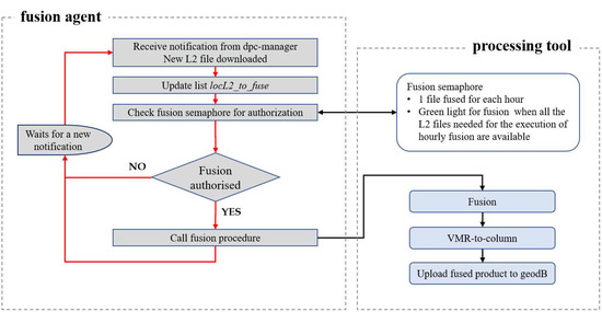 Figure 7 represents the module flow chart and, in particular, the interaction between the fusion agent and the fusion tool. The fusion agent invokes the fusion procedure when all the needed level 2 files are available. In particular, in extra-European areas, three files are expected (LEO, three spectral bands); where also S4 (GEO) products occur, six files are expected (LEO+GEO, three spectral bands). The DPC agent also implements a strategy that allows managing possible shortage in the availability of one or more files.