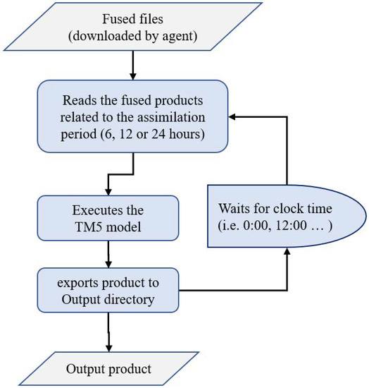 The high-level flow chart of the assimilation module is reported in Figure 8. The TM5 system does not start a new assimilation for each new fused product that is produced upstream; the assimilation procedure only starts at a particular clock based time (e.g., 00, 12 UTC); it generates in output (local disk) a file product for each period under analysis. The DAS generates in output a netCDF file containing the four-dimensional global ozone analyses and forecasts. The final characteristics of the output product were defined as a compromise between what was considered affordable in AURORA in terms of data size and the requirements dictated by the calculations of the ground UV-index and tropospheric ozone, and ultimately by those needed in the development and use of the AURORA downstream applications.