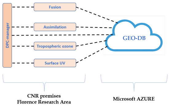 The technological infrastructure, developed in order to implement the AURORA data processing chain, was realised following a distributed processing approach architecture (Figure 3). It is mainly composed of a geo-database (geo-DB), which is described in more details in Section 4.1 and it was designed to store all the data required for the processing (input and auxiliary data, intermediate and final products); four independent modules run on independent servers (described in details in Section 4.3) and are devoted to execute the four steps of processing; the DPC-manager (see Section 4.4), that is a supervising module able to manage the data processing and to schedule the activities of each computational tool. Each DPC-component is designed as an independent module running on different servers.