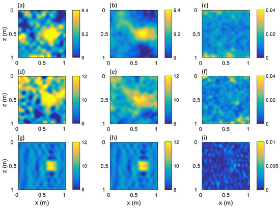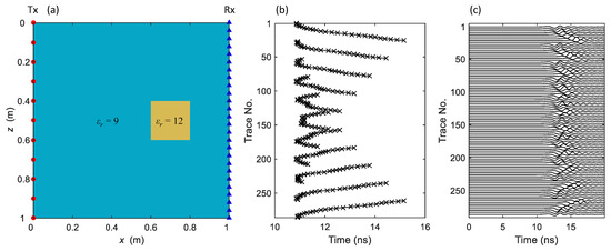In this section, a synthetic model is created for simulating crosshole GPR detection of a defect in an underground concrete structure. As shown in Figure 1a, a 1.0 m × 1.0 m model was built with to simulate the concrete structure (background), and a 0.2 m × 0.2 m higher relative permittivity () area was created as the defect (target). Crosshole GPR measurements were simulated using 11 transmitters on the left side and 26 receivers on the right side of the model.