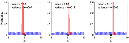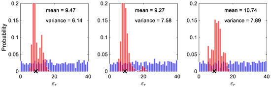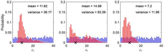 Histograms of the prior (blue bars) and posterior (red bars) distribution of three randomly selected parameters derived from Bayesian inversion using the FDTD forward model with waveform data. The true values of the parameters are denoted with black crosses.