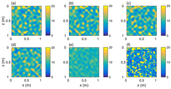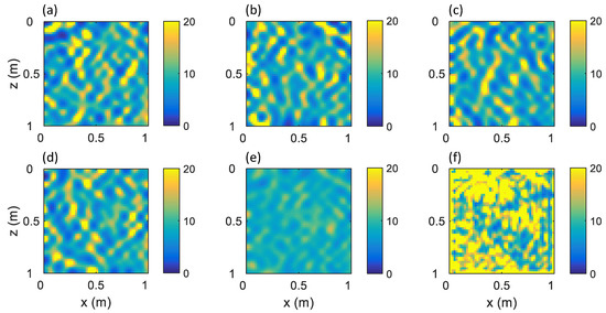 In order to obtain crosshole GPR data, the gprMax software [35,36], which is an FDTD solver of the Maxwell’s equations, was used to perform numerical simulations. The model depicted in Figure 1a is discretized, with a grid size of 0.02 m × 0.02 m, leading to a total number of unknown relative permittivity values, subject to estimate. The FDTD simulations use the Ricker wavelet with a center frequency of 500 MHz as the source, and collect a 20 ns GPR waveform for each transmitter–receiver pair.