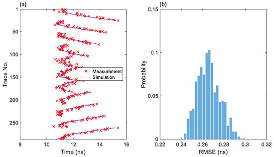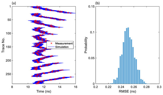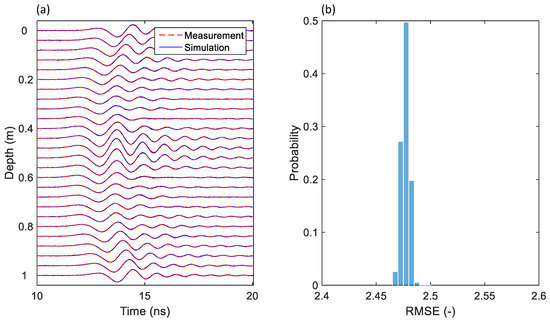 Fitting of the measurement data by the posterior models derived from Bayesian inversion using the FDTD forward model: (a) measured and simulated waveforms, and (b) histogram of the RMSE values of the posterior solutions.