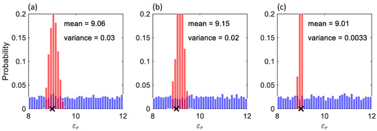 First, the straight-ray forward model with first-arrival traveltime data was used to infer the relative permittivity field. After 1,440,000 model evaluations, all parameters converged to their target distribution, and the last 50% of the parameters after convergence were considered as posterior samples. Figure 2 displays the histograms of the prior (blue bars) and posterior (red bars) distribution of three randomly selected parameters. Before inversion, the parameters were uniformly distributed in the prior range. After inversion, the parameters moved toward the true values marked with black crosses. However, the mean values were estimated with large errors, and the posterior parameters were distributed in a wide range with large variance.