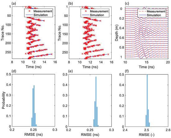 Figure 10a presents the simulated waveforms of the posterior parameters using the transmitter position of m and all receiver positions from 0 to 1 m. The posterior models exhibit an excellent fit to the observed waveforms. Figure 10b displays the distribution of the RMSE values of the posterior solutions, which is close to the real value of the measurement error. Therefore, the FDTD forward model with waveform data is capable of characterizing the relative permittivity field.