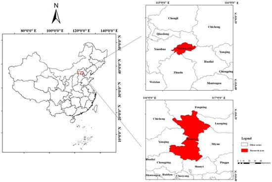 The selection of the study areas was based on three criteria: (a) the street trees should be representative of similar areas elsewhere; (b) they should be far from tall buildings and be free from interference by strong magnetic fields; and (c) they should not be no-fly zones for drones. After several on-site inspections before deploying a drone, and after comprehensively considering the above factors, we selected the Huairou District of Beijing (116°37′E, 40°20′N) and the Xiahuayuan District of Zhangjiakou City in Hebei Province (115°16′E, 40°29′N) (Figure 1) as study areas. A total of seven roads were selected in the two areas, and for the roads, an experimental plot of 50 m in length was selected. The morphological attributes of trees change as they mature; therefore, the street tree species selected in this study were mature. Mature trees grow relatively slowly and the species selected would not have changed significantly over 2–3 years. The main species of street trees in the experimental areas are Fraxinus pennsylvanica, Ginkgo biloba, Robinia pseudoacacia, Acer negundo, Populus tomentosa, and Koelreuteria paniculate.