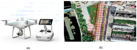 Unmanned aerial vehicle (UAV) and flight route map. (a) DJI (Da-Jiang Innovations, Shenzhen, Guangdong, China) Phantom 4 RTK (Real Time Kinematic) used in the study. (b) Schematic diagram of the flight path, taking sample plot 4 as an example.