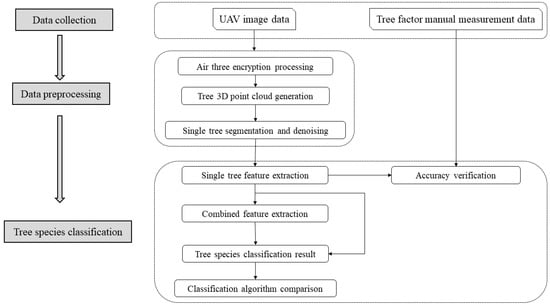 The single tree attributes of different tree species are quite different, and those of the same tree species are similar; therefore, tree species are classified according to the differences in attributes between different species. The experimental steps for achieving this were as follows: (i) extraction of single tree attributes and accuracy verification; and (ii) selection of different machine learning classifiers for tree species classification, and comparison and analysis of the classification results to select the best classifier. The complete workflow is illustrated in Figure 3.
