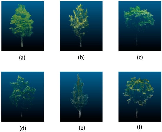 Point cloud results for each tree species. (a) Fraxinus pennsylvanica; (b) Ginkgo biloba; (c) Robinia pseudoacacia; (d) Acer negundo; (e) Populus tomentosa; and (f) Koelreuteria paniculate.