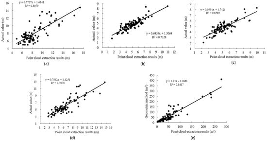 Scatter plots of the relationship between extracted tree attributes and the true values. (a) Tree height vs. the true value; (b) X crown width vs. the true value; (c) Y crown width vs. the true value; (d) crown height vs. the true value; and (e) crown volume calculated using the voxel method vs. the optimal value.