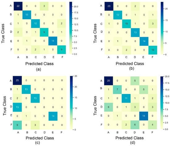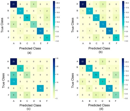 Classification results for different tree species using tree attributes. A, B, C, D, E, and F represent Fraxinus pennsylvanica, Ginkgo biloba, Robinia pseudoacacia, Acer negundo, Populus tomentosa, and Koelreuteria paniculate, respectively. (a) Random forest; (b) back propagation (BP) neural network; (c) support vector machine; and (d) K-nearest neighbor.
