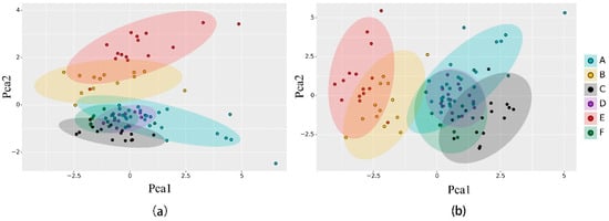 Biplots of the results of principal components analysis of tree attributes. A, B, C, D, E, and F represent Fraxinus pennsylvanica, Ginkgo biloba, Robinia pseudoacacia, Acer negundo, Populus tomentosa, and Koelreuteria paniculate, respectively. (a) PCA (principal component analysis) results using individual attributes; (b) PCA results using combined attributes.
