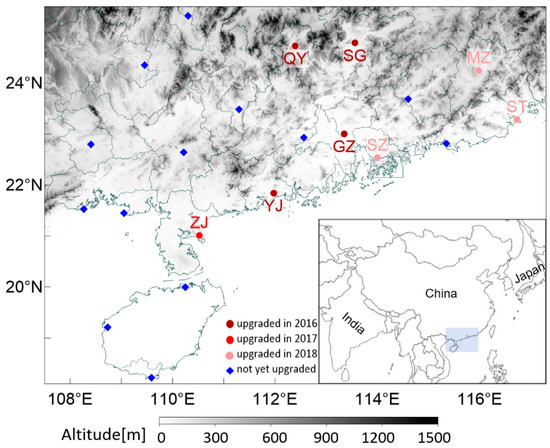 Figure 1 illustrates the locations of CINRADs and the surrounding topography in South China. Radars in Guangzhou (GZ), Yangjiang (YJ), Qingyuan (QY), Shaoguan (SG), Shenzhen (SZ), Meizhou (MZ), Shantou (ST) and Zhanjiang (ZJ) completed the polarimetric upgrade between 2016 and 2018, while other radars were scheduled to be upgraded after 2019. Among the eight upgraded radars, the GZ, YJ and ZJ radars are stationed close to the coast with a flat terrain, whereas the QY and SG radars are located in mountainous regions. The topography in South China reveals that the issue of clutter contamination faced by the new polarimetric radars is highly representative for the whole of China.