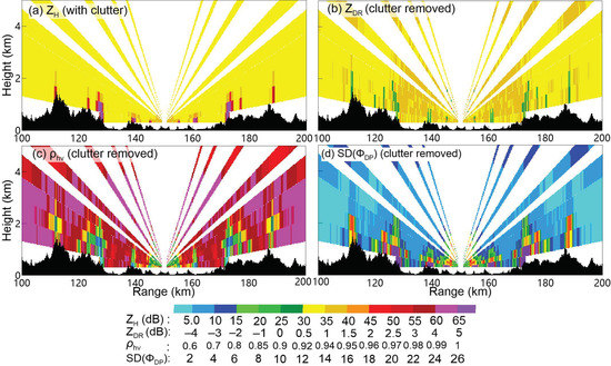 Figure 2 shows an example of the horizontal structures of accumulated measurements of the SG radar from 2016 to 2017, including the ZH before and after the clutter mitigation, mitigated ZDR, ρhv and the standard deviation of ΦDP (SD (ΦDP)).