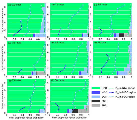 It is surprising that the proportion of MGC and SGC regions was much higher than that of the FBB and PBB regions in most of the accumulated data, suggesting polarimetric contamination to be the primary factor affecting data quality in South China. The PRA in the NGC region was close to 1, whereas the MGC and SGC regions had a much lower prior probability (~0.5 and ~0.2); this demonstrates that the clutter contamination could contribute to numerous polarimetric outliers over a long period. A significant difference in the SGC proportions were found among the eight polarimetric radars in South China. Radars located in the YG, SG, MZ, ZJ and QY stations were less affected by the SGC contamination, with the proportions ranging from 6% to 12% in the first layer and less than 6% at other elevations. In contrast, the proportions of the SGC region in the ST, SZ and GZ radar were much higher than others, reaching 19% to 26% in the first layer, which was ascribed to severe sidelobe contamination.