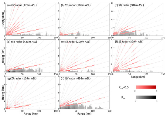 All accumulated pixels with a PRA less than 0.5 and the terrain height below these outliers were projected to the range-height profiles in Figure 5 to investigate the relationship between the clutter contamination and the terrain around the radar. The common feature among radars with less sidelobe influence (YJ, SG, MZ, ZJ and QY radar) was that all the contaminated pixels were concentrated in a limited spatial distribution. Even for the SG, MZ and QY radars with complex terrain and considerable blockage, the outliers were slightly spread to higher elevations with small proportions. But for the three radars of GZ, ST and SZ near the coast, extensive and continuous polarimetric contamination occurred in most elevations within a radius of 100 km, which demonstrated that abnormal pixels with large proportion and wide spatial distribution had little correlation with the terrain. Considering that the above radars were deployed in the cities with the top population density in Guangdong province, the actual reason might be related to impact of megacities on microwave propagation and needs to be further investigated.