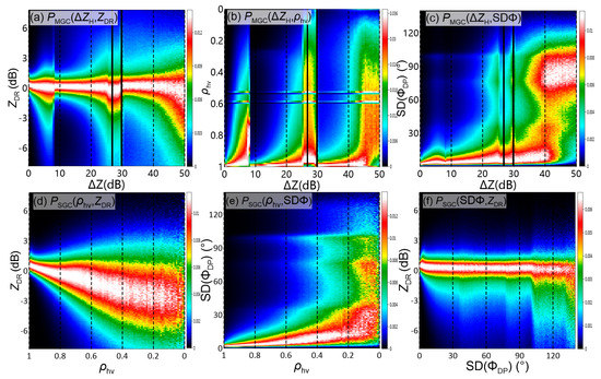 (a–c) The two-dimensional joint probability density function of PMGC(ΔZH, ZDR), PMGC(ΔZH, ρhv) and PMGC(ΔZH, SD(ΦDP)). The statistical data were collected from the MGC regions between 2016 and 2017 and limited to the thresholds of SNR > 25 dB and pixel altitude < 3.5 km. (d–f) The same as (a–c) but for PSGC(ρhv, ZDR), PSGC(ρhv, SD(ΦDP)) and PSGC(SD(ΦDP), ZDR)) collected from the SGC regions.