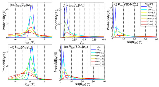 (a) The marginal probability functions of PMGC(ZDR|ΔZH) calculated using the two-dimensional joint probability functions in Figure 6. (b–e) Same as (a) but for PMGC(ρhv|ΔZH), PMGC(SDΦ|ΔZH), PSGC(ZDR|ρhv) and PSGC(SDΦ|ρhv).