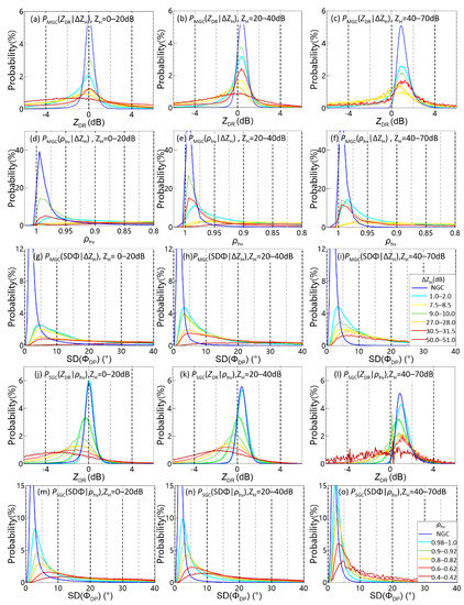 Marginal probability functions of PMGC(ZDR|ΔZH) in (a) light rain (ZH = 0–20 dBZ), (b) moderate rain (ZH = 20–40 dBZ) and (c) heavy rain (ZH = 40–70 dBZ), where statistical data were collected from the MGC regions between 2016 and 2017 and limited to the thresholds of SNR > 25 dB and pixel altitude < 3.5 km. (d–i) The same as (a–c) but for the marginal probability functions of PMGC(ρhv|ΔZH) and PMGC(SDΦ|ΔZH). (j–o) Marginal probability functions of PSGC(ZDR|ρhv) and PSGC(SDΦ|ρhv) calculated in the SGC regions under light, moderate and heavy rain conditions.