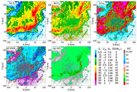 Horizontal structures of (a) ZH, (b) ZDR, (c) ρhv, (d) SD(ΦDP) after clutter mitigation and (e) hydrometeor classification (HC) results at an elevation angle of 0.5° by the GZ radar at 0606 LST on 13 April 2016.