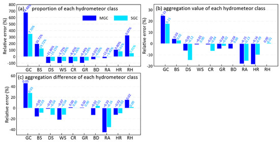 The proportion of each hydrometeor class in the NGC regions between 2016 and 2017, representing the climate characteristics of GZ radar, was used as the criterion to quantitatively analyze the clutter impact on the HC algorithm. The absolute and relative errors of each class were shown in Figure 10a and the pixel numbers in the MGC, SGC and NGC regions were limited to be approximately equal to guarantee the representativeness of statistical results. Evidently, the frequency of the GC/AP and BS class in the clutter-contaminated pixels was several times than that in normal pixels and the proportion of other hydrometeor classes almost decreased. Histograms reveals that the relative error was related to both the clutter degree and the phase state of the HC class. Due to the severe impact of mainlobe contamination, the changed proportion in the MGC regions was 1.5 to 2 times that in the SGC regions. Similarly, owing to the concentrated polarimetric characteristics of ice-phase hydrometeors, the DS, WS, CR and GR classes showed weaker capabilities of fault tolerance than that of RA class. A phenomenon related to false alarms should be pointed out. The decreased ZDR and ρhv caused by ground clutter were consistent with the membership functions of HR and RH, causing an abnormal increase of the above two classes in the contaminated regions.