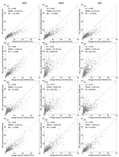 Scatterplots of retrieved hourly rainfall vs. gauge observations: (a) R(ZH) in the NGC region, (b) R(ZH) in the MGC region, (c) R(ZH) in the SGC region. (d–f), (g–i), (j–l) The same as (a–c) but for the retrieved results of R(ZH, ZDR), R(KDP) and R(AH), respectively. The radar dataset came from 12 long-term rainfall cases with 75 h observations by the GZ radar in 2016 and 2017, the pixels were limited to a loop region ranging from a 45 to 60 km radius. The gauge dataset came from 42 rain gauges in the loop region where number of gauges in the MGC, SGC and NGC regions were approximately equal.