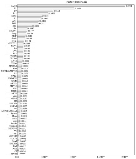 | RF | 9 features: , B2, B3, B4, B8A, B9, B10, B11, B12 | 9 features: CONTRAST, DISS, ENT, INERTIA, PROM, SAVG, SENT, SHADE, VAR | 42 features: ARI, ARVI2, AVI, AWEI, Bpan, BAIS2, BI, BRI, BWDRVI, CARI, CI, CRI700, CVI, DVI, EPIChla, EPIChlb, GARI, GDVI, GNDVI, GNDVI2, VARIgreen, MCARItoMTVI2, MCARItoOSAVI, MNDWI, MSAVI2, MSAVI, MSBI, MTVI2, NBR, NDSI, NDVI, NGRDI, PVR, RBNDVI, REIP, RI, SAVI, SIPI, SIWSI, SLAVI, VI, VI700 |