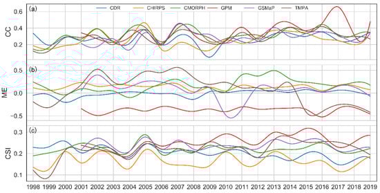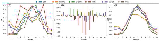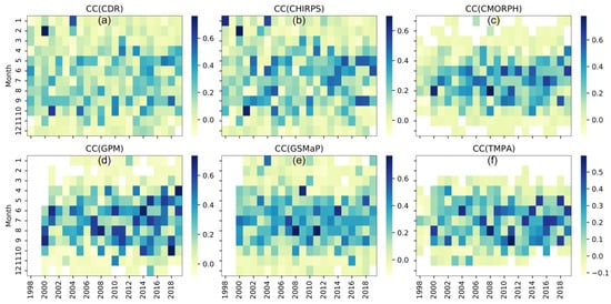 - In the multi-year evaluation, the correlation between each dataset and the NW stations was improving with time, especially during the rainy season (from April to October); among them, the GPM had the largest increase. For the evaluation within the year, the CDR and CHIRPS were the two best datasets in the winter performance, and all datasets tended to perform better in the summer;