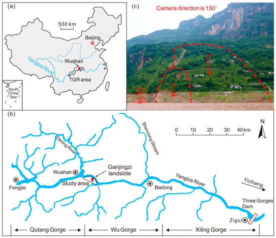 Location of the study area: (a) site location of the study area in China, (b) location of the Ganjingzi landslide, and (c) geomorphological characteristics of the Ganjingzi landslide.