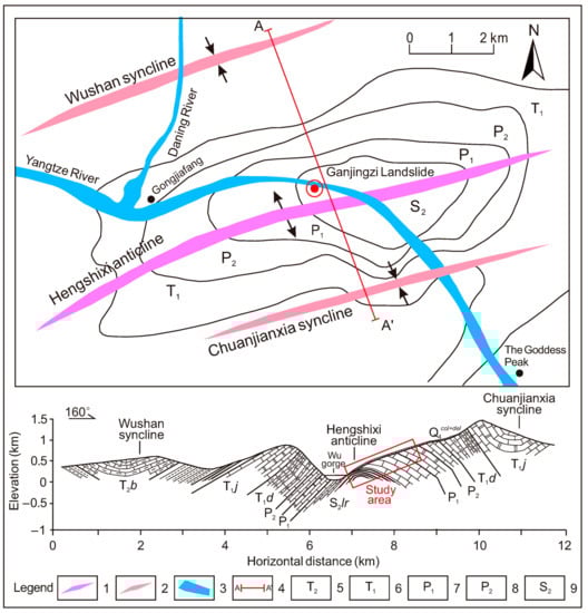 Tectonic background of the study area: (1) anticline, (2) syncline, (3) the Yangtze River, (4) cross section, (5) Middle Triassic strata, (6) Lower Triassic strata, (7) Lower Permian strata, (8) Upper Permian strata, and (9) Lower Silurian strata.