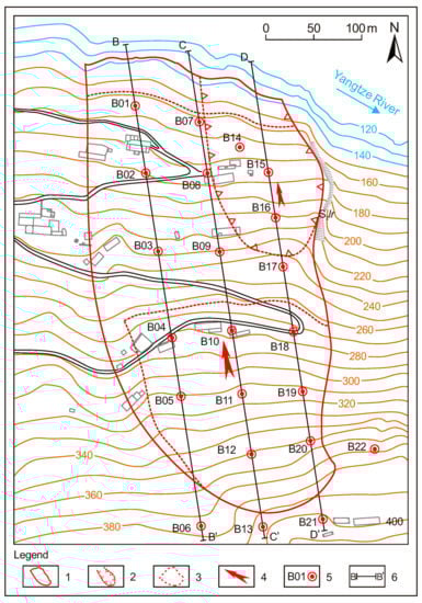 Topographic map of the Ganjingzi landslide, with a contour interval in 10 m increments: (1) landslide boundary, (2) boundary of the active zone, (3) potential boundary of the shallow deformation, (4) sliding direction, (5) borehole, and (6) cross section.