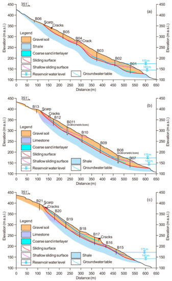 Geological sections of the Ganjingzi landslide: (a–c) longitudinal geological section B-B’, C-C’, and D-D’. Please see the location of geological sections in Figure 4.