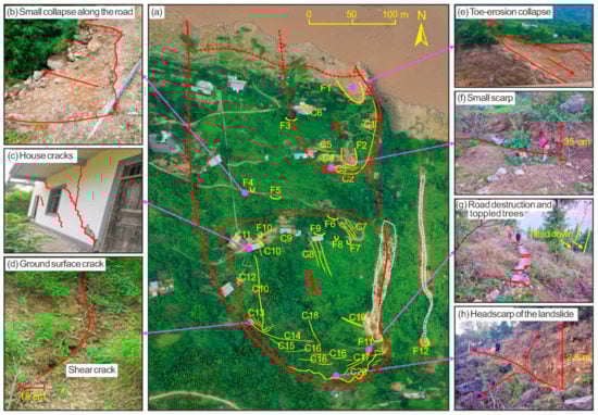 Deformation characteristic of Ganjingzi landslide: (a) distribution of cracks and shallow failure, and (b–h) macroscopic deformation of Ganjingzi landslide.