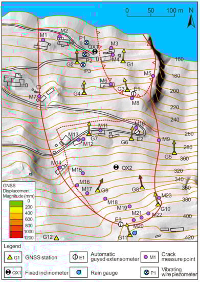 Layout of the real-time monitoring system. Arrows show the magnitudes and directions of the cumulative displacement obtained by global navigation satellite system (GNSS) receivers (data from 15 July 2015 to 7 March 2018).
