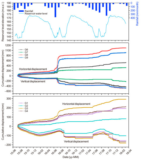 The cumulative displacement curves acquired from GNSS receivers are shown in Figure 11. These curves give the surface movement in the past four years, on which basis the time evolution of the landslide can be analyzed. The horizontal displacements exhibit step-like characteristics over time, and they feature with accelerated motions in a short period. After these accelerations, the slow creep movements are maintained for a long time. In detail, the acceleration phases are normally from early May to late August each year. This period is just corresponding to seasonal rainfall and the drawdown of the reservoir water level. For the remaining eight months, the displacement rates gradually decrease with reservoir impoundment and less rainfall. Vertical displacements in the upper and central parts (G6–G9) also show accelerated deformations, which agree well with the horizontal curves. However, vertical displacements in the downslope (G1 to G4) alternately increase and decrease, indicating that the toe of the landslide is constantly bulging and subsiding. After the acceleration period of the landslide movement, the vertical displacements of the front part decrease.