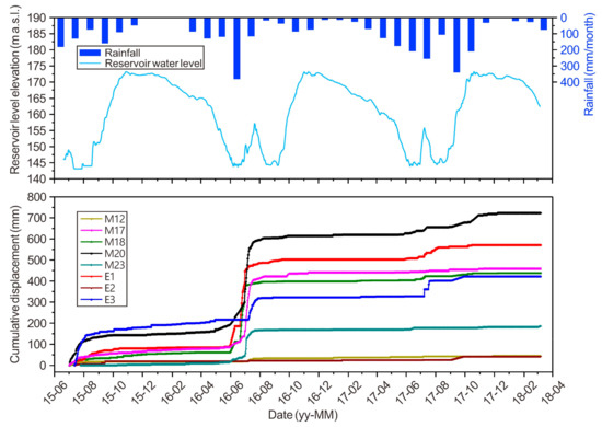 Cumulative displacements measured by GNSS monitoring, and the associated reservoir water level and rainfall.