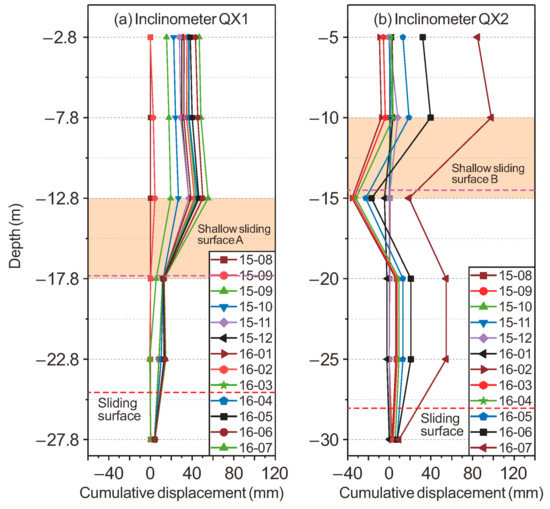 Inclinometer monitoring was applied to determine the subsurface deformation and detect the slip zones of the landslide. Each fixed inclinometer could acquire shear displacement at 5 m intervals, and the displacement of the deepest sensor fixed in the stable bedrock is almost zero. Based on the data obtained from August 2015 to July 2016, the displacement profiles of inclinometers QX01 and QX02 are shown in Figure 13.