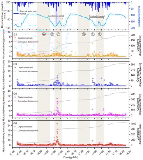 The monitoring results indicate that the activity of the Ganjingzi landslide varies with time and is more significant from May to August. As shown in Figure 11 and Figure 12, the acceleration phases agree well with the decline of the reservoir water level and heavy rainfall. In order to assess the influencing intensity of these two external factors, hydrological data and the horizontal displacements from GNSS (G1, G3, G6, and G8) were analyzed systematically. The relationships between the displacement velocity and external hydrological events are illustrated in Figure 15.