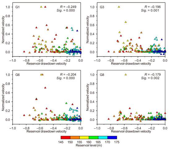 Correlation between reservoir drawdown velocities and normalized horizontal velocities measured at the GNSS stations. The color of the triangles indicates the reservoir level. (Note: R is the Pearson correlation coefficient and Sig. is the significance; the value of Sig. less than 0.05 means significant correlation.)
