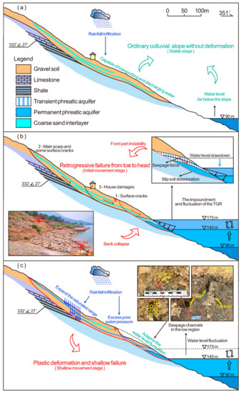Since the operation of the TGR, community-based monitoring has suggested that there was a series of evidence of damage that emerged from the bottom up of the landslide (Figure 8). On this basis, the landslide was regarded to enter the initial movement stage (Table 5). This kind of retrogressive failure was correlated with the large-scale rising and periodic fluctuations of the reservoir water level. First, the uplifting reservoir water level influenced the groundwater regime within the landslide body, and a phreatic aquifer was formed and expanded at the lower part of the sliding deposit (Figure 17b). The invasion and periodic fluctuation of reservoir water softened the sliding materials, especially reducing the shear resistance along the slip surface [42]. Second, groundwater seepage caused by the drawdown of the reservoir water level decreased landslide stability. When the reservoir level drops rapidly, the dissipation of pore water pressure in the landslide body is slower than the decrease of external hydrostatic pressure [18,43,44]. The transient seepage induced by this lagging effect creates seepage force along the sliding direction [45], which increased the slip force and further reduced slope stability. Therefore, the deformation in this stage mainly occurred with the decline of the reservoir water level (Figure 8). The relationship between the stability of the Ganjingzi landslide and the reservoir water level was similar to many other colluvial landslides in the TGR area [7,26,30,35,46]. Such as the Shuping and Baishuihe landslides [26,46], the GNSS data show that the accelerated deformation of these landslides is also related to the reservoir water drawdown. Third, the submerged toe area was eroded by the reservoir water, and thus the upper part of the landslide gradually lost its front resistance. The landslide continued to deform retrogressively, and the main scarp was finally generated (Figure 7h).