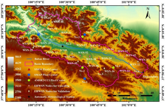 The study area is situated in the Babao River basin, which is located in the eastern branch of the upper reach of the Heihe River basin, northwestern China (Figure 1). The study area has an area of 2495 km2, and elevation ranges from 2640 m to 5000 m. Alpine meadows are distributed in the elevation range from 2600 m to 3800 m and become sparser at elevations exceeding 3800 m; forest is dotted near 3100 m. The mean annual air temperature is approximately 0.7 °C, and the soil is unfrozen from May to September and primarily consists of sand (27–45%), silty (43–63%), and clay (10–14%) (10.3972/heihe.023.2013.db). The annual rainfall is approximately 400 mm and has an increasing trend from the northwest to southeast. Rainfall frequently occurs in summer and enhances the spatial heterogeneity of SM. As a whole, the SM on shady slopes is higher than that on sunny slopes, and the soil is wetter in the mountains than in the valleys [29].