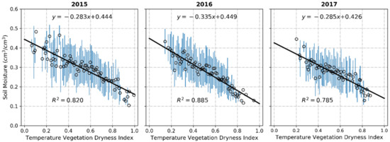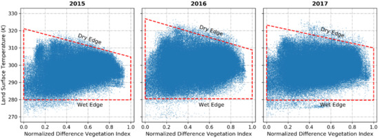 The MODIS NDVI and LST products are used to establish the LST-NDVI space during the unfrozen season. To obtain comparable TVDI values among different days in a year, it is feasible to plot the annual LST-NDVI scatterplot [57]. To determine the parameters of dry and wet edges, the range of NDVI values (x-axis in Figure 3) is first split into several equal intervals, and then the minimum and maximum LST values in each interval are extracted from the LST-NDVI space. Finally, as shown in Figure 3, is estimated by averaging the minimum LST value in each interval, and is determined by fitting points with maximum LST values. The points located outside dry and wet edges as outliers are not calculated. From 2015 to 2017, the wet edges were almost the same, but the differences among annual dry edges were obvious, and in 2016, there was a maximum dry edge due to the high LST value. By analyzing meteorological data from station A’rou, it was also proven that the near-surface mean air temperature in the unfrozen season of 2016, with a value of 9.62°C, was higher than those with values of 8.21°C and 8.98° in 2015 and 2017, respectively.