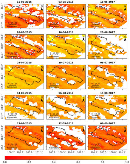 Based on the estimated dry and wet edges, the daily TVDI values were calculated according to Equation (6). Figure 4 shows the spatial distribution of the TVDI over several days. Due to cloud cover, the TVDI data had a mass of missing pixels, but the spatiotemporal changes in the dry and wet conditions of soil could be captured. There were significant seasonal variations in the TVDI data from May to September each year. The dry index was higher on the lowland area around the Babao River from northwest to southeast than that in the mountains and was lower on the south slope than on the north slope, indicating that the spatial distribution of the TVDI was in accordance with that of the SM in the Babao River basin, as described in Section 2.1. The SM observations from the 16 upscaled EHWSN nodes were used to build relationships with the TVDI values at the pixels spatially corresponding to ground-based sites. As shown in Figure 5, a monotonically decreasing linear function was fitted according to Equation (7), showing a goodness of determination coefficient indicating the high correlation between the TVDI and SM. Then, the linear regression model was used to transform the TVDI into samples of the upscaled SM.