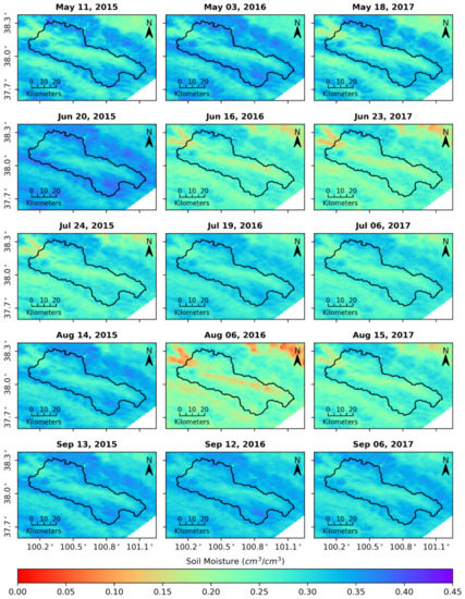 - O’Neill, P.E.; Chan, S.; Njoku, E.G.; Jackson, T.; Bindlish, R.; Chaubell, J. SMAP Enhanced L3 Radiometer Global Daily 9 km Ease-grid Soil Moisture, Version 3; NASA National Snow and Ice Data Center Distributed Active Archive Center: Boulder, CO, USA, 2019. [Google Scholar]