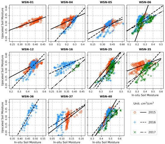 The most direct way to evaluate the coarse-scale SM is to upscale ground-based observations by calculating their mean. The validation uncertainty is affected by the spatial observation density. In this study, the EHWSN shows a low sampling density, which makes it difficult to meet the validation requirement of large-scale RS SM products by averaging multipoint observations [55]. An upscaling algorithm based on temporal data was employed to solve upscaling spatially sparse observations.