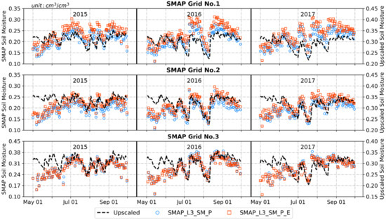 As shown in Figure 9, SMAP products including SMAP_L3_SM_P and SMAP_L3_SM_P_E (the SMAP_L3_SM_P_E product was first aggregated to 36 km) were compared with the upscaled SM at the spatial scale of 36 km. The accuracies of both SMAP products on the ubRMSE and R indexes were almost the same, with average statistical values of 0.028 cm3 cm−3 and 0.610, respectively. The difference in their accuracy values was mainly reflected in the bias index, indicating that the SMAP_L3_SM_P and SMAP_L3_SM_P_E products were underestimated by 0.066 cm3 cm−3 and 0.054 cm3 cm−3 (see Table 3), respectively. The larger underestimation occurred in May and June because the modeled surface temperature showing obviously seasonal changes with low values in the same months was adopted in the SMAP SM retrieval. As a whole, the disaggregated SMAP_L3_SM_P_E product preserved the original brightness temperature used in the retrieval of the SMAP_L3_SM_P product. Thus, both SMAP products had similar accuracies, which was also proven using ground-based observation networks at the global scale in the study of Chan et al. [58].