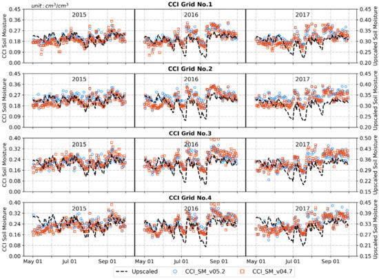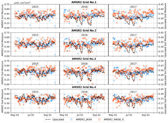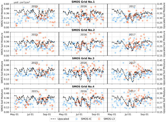 3.4. Comparisons between the Upscaled SM and Microwave Remotely Sensed SM Products