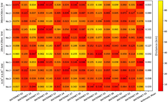 Root-mean-square errors (RMSEs) between in situ measurements and the upscaled SM at multiple pixel scales. The gradient color represents spatial distances between the ground-based sites and the center points of pixels. The asterisk means that the site locates within the pixel zone. The arithmetic mean values are obtained by averaging the ground-based observations derived from multiple sites within the same pixel area. The RMSEs between arithmetic mean values and their corresponding upscaled SM at different pixel scales are shown in the extreme righthand column.