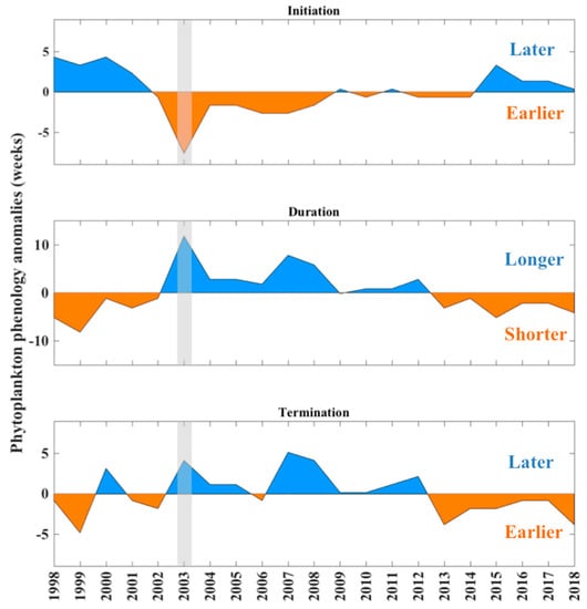 Interannual phenology anomalies (weeks) of the nano/micro-phytoplankton assemblage (timings of the winter bloom initiation, duration, and termination) between 1998 and 2018. The grey shaded bar highlights the event that occurred during the winter blooming period of 2003.